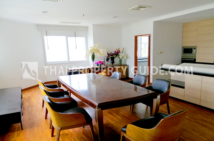 Simple elegant remodeling for a spacious condominium. Professionally decorated by a very accomplished interior designer, the classic black and white theme softened by natural wood floors and selected antique furniture appeals to all tastes. The wooden deck balcony overlooks the high rises on Sathorn just behind the green gardens of private homes. The building has a large swimming pool and gym for the comfort of the tenants, and the compound has a tennis court and large gardens and jungle gyms for the kids.