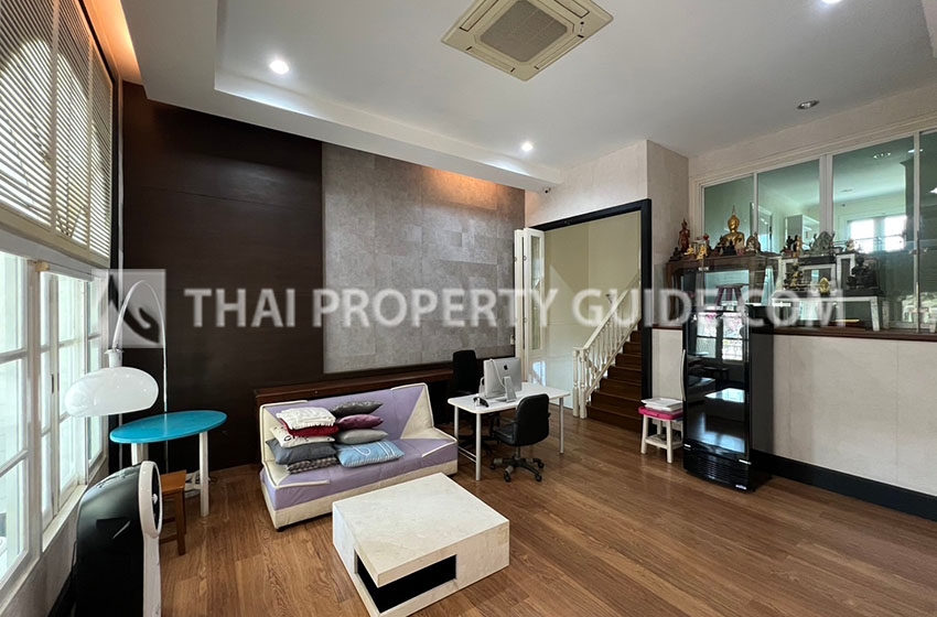Lovely modern Spanish style townhouse, fully furnished ,high ceiling beautified with huge french windows, large bedrooms, fitted kitchen and breezy veranda with green leafy atmosphere.Located near Bangkok Patana School.