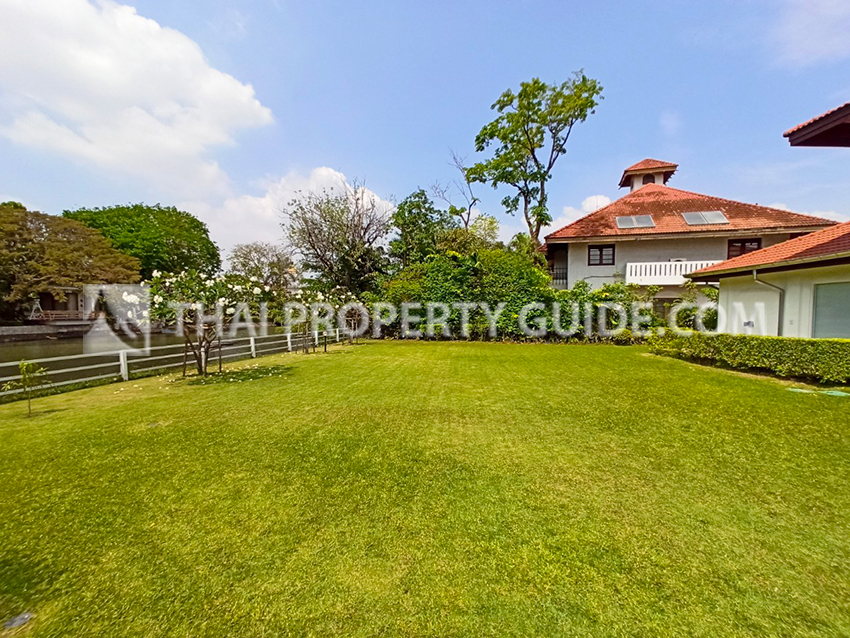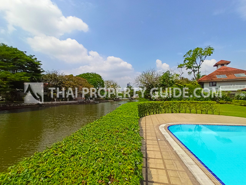 Pet friendly house with private pool, a huge front yard and a lake in Bangna. This 4000 sqft house sits on 1/4 acre in a private secure compound with a private lake. The house has large separate living and dining rooms and a large american style kitchen equipped with a full sized oven and dishwasher.